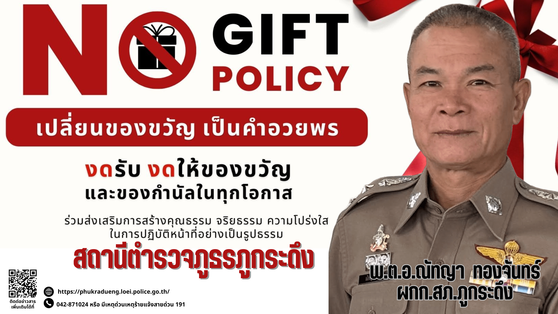 - ประกาศสำนักงานยุทธศาสตร์ตำรวจเรื่องเจตนารมณ์ที่จะไม่รับของขวัญหรือของกำนัลทุกชนิดจากการปฏิบัติหน้าที่